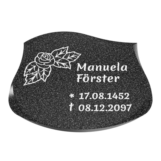 Mit den Maßen 40 cm breit, 30 cm tief und 4-6 cm hoch bietet die Borsus Liegeplatte eine harmonische Proportion. Die Schweifbogenform und das Wechselspiel aus spitzen und abgerundeten Kanten verleihen der Platte ein lebendiges und abwechslungsreiches Erscheinungsbild. Diese Gestaltung symbolisiert ein facettenreiches Leben, geprägt von Höhen und Tiefen, und erinnert an eine Person, die sowohl die Ruhe als auch das Abenteuer schätzte.